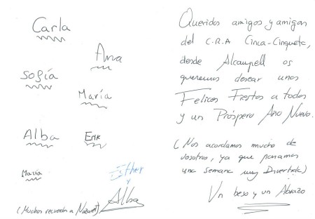 Se ve que nuestros alumnos hicieron muy buenos amigos en su estancia en el CRIE Venta del Olivar. Nos han escrito una postal para felicitarnos las fiestas. ¡Gracias!